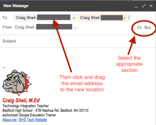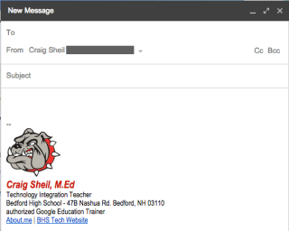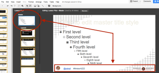 Below is an example of what my ‘footers’ look like on a Google Slide. I tend to always include my Google profile picture (that will link to my Google+ account), a link to my Twitter account, as well as my tech hashtag. You will also on the far right I have a picture of the BHS tech logo.