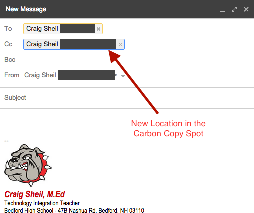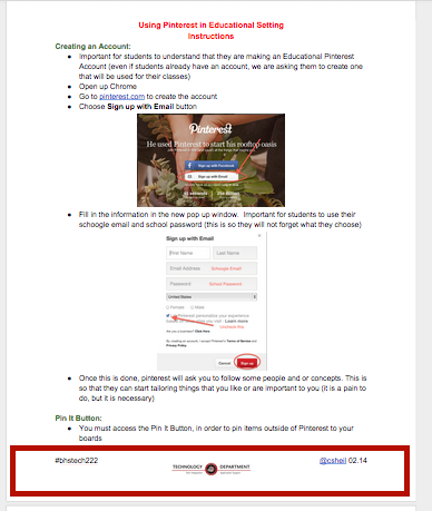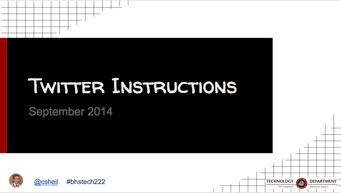 Below is an example of what my ‘footers’ look like on a Google Slide. I tend to always include my Google profile picture (that will link to my Google+ account), a link to my Twitter account, as well as my tech hashtag. You will also on the far right I have a picture of the BHS tech logo.