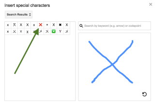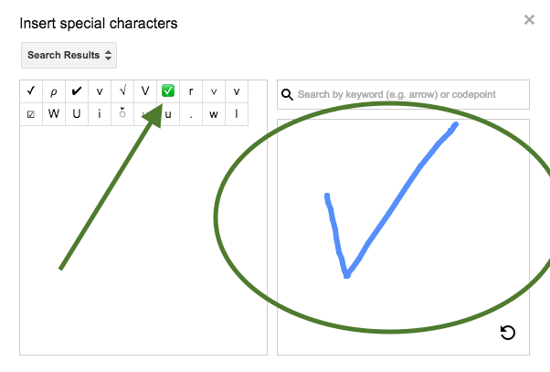 Use the draw symbol box on the right hand side to find what you are looking for. You will notice that we drew in a check mark. Then, choose the green check mark so that it can be seen easily in a student’s paper. By selecting it, it will be inserted on your blank Google Document.