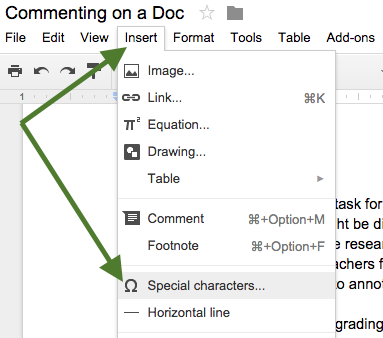 Find a check and an x that you will want to use to insert in a Google Document. To do this, open up a blank Google Document. Then choose Special Characters – found under the Insert Menu.