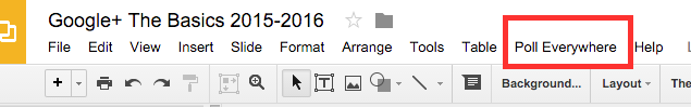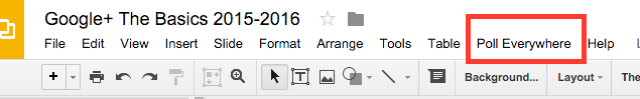 Open up a Google Slide presentation that you would like to include a question or two in your presentation. You will notice the new menu option: Poll Everywhere.