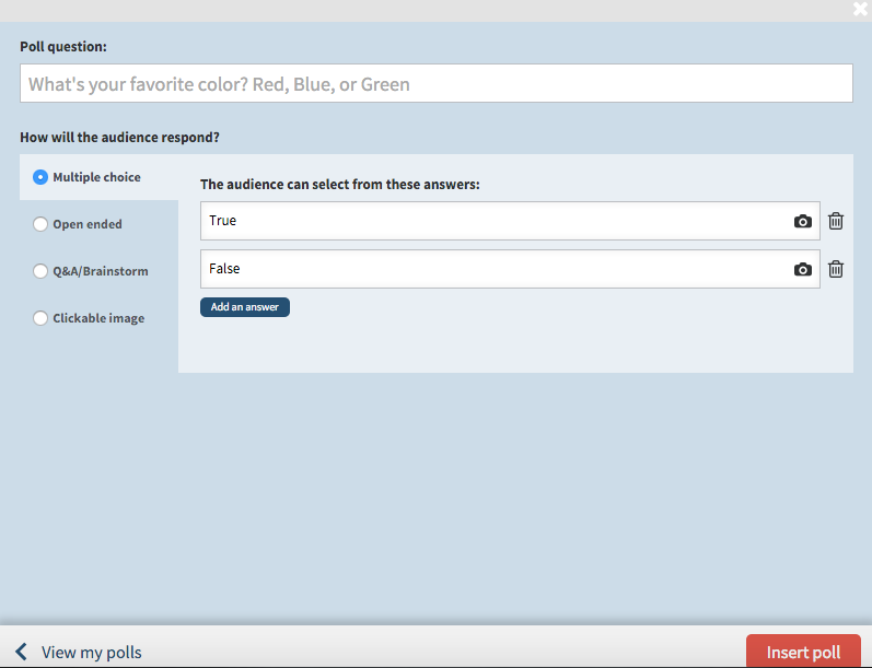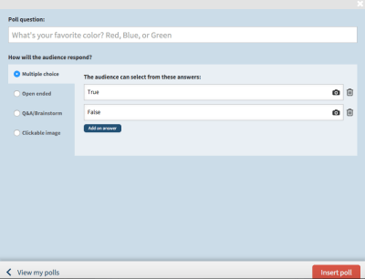 Then select Create Poll. A pop up window will appear for you to choose the type of question. Once you hit insert poll, it will automatically insert a slide with that poll question on it.