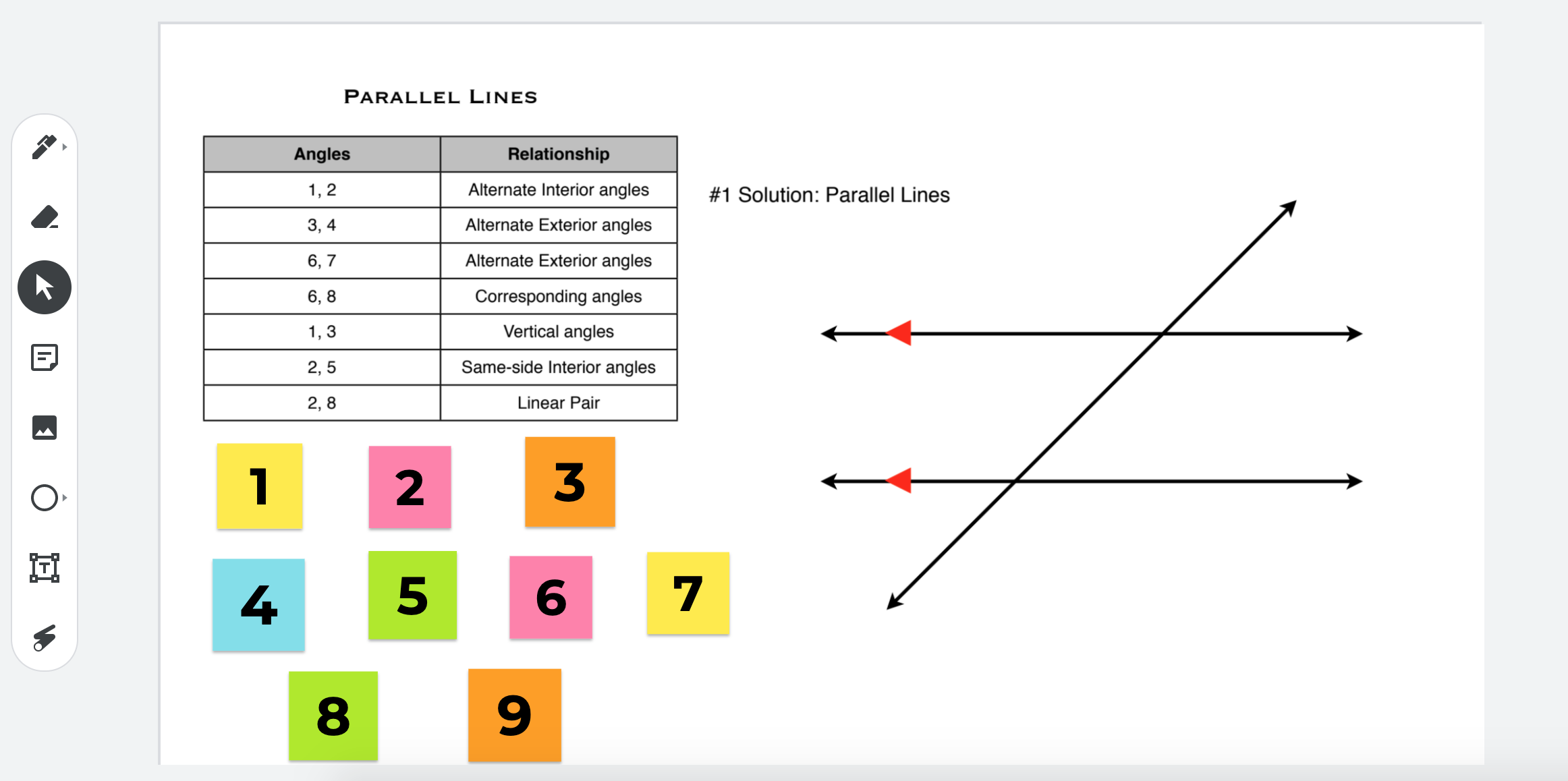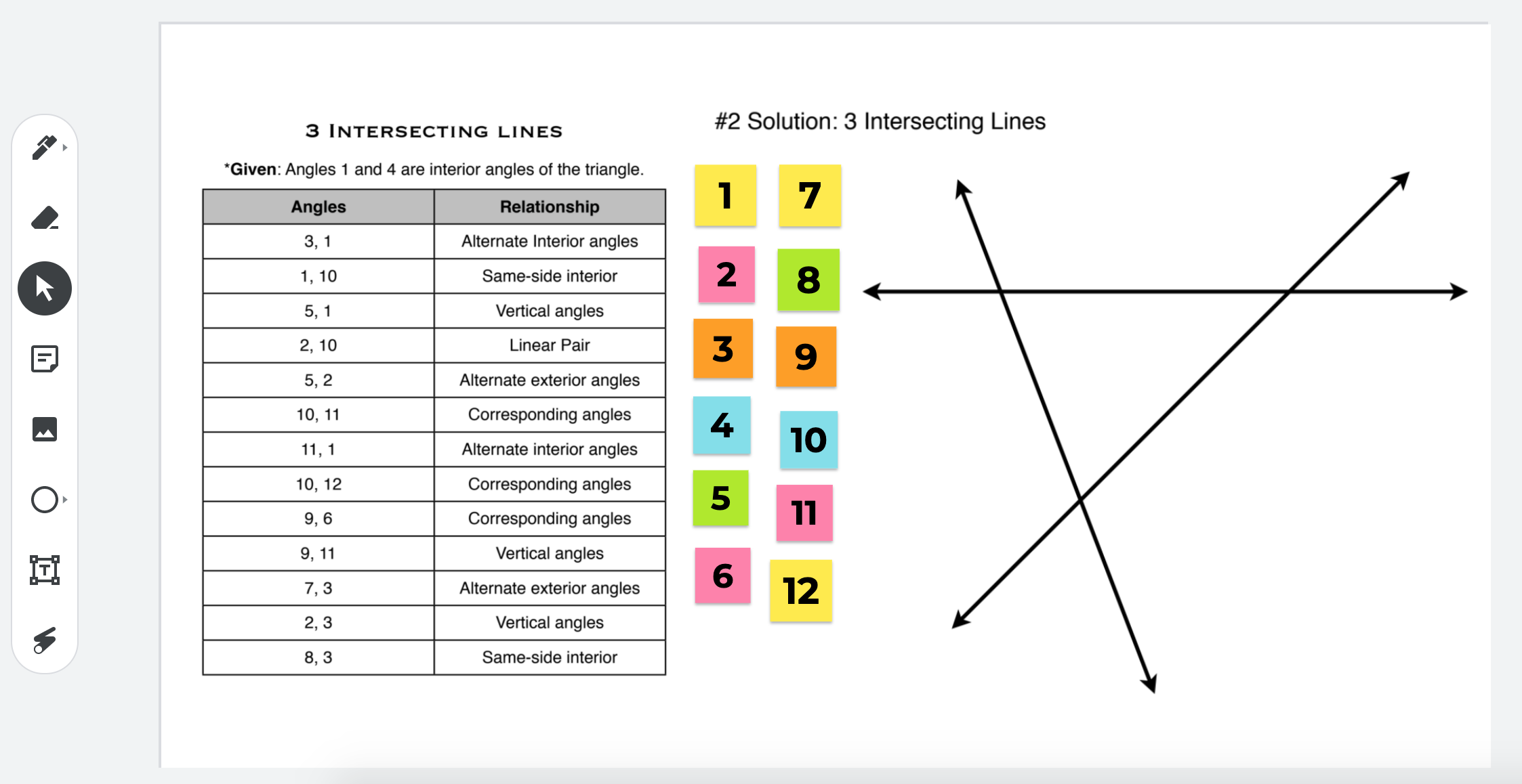 How was this created? The two teachers took screenshots of the the diagram as well as the angle information. They then created multiple stickies to match the angle names. Once each pair receives their copy, they have the ability to move the stickies to the appropriate spots. To see what this looks like in Jamboard, click HERE.