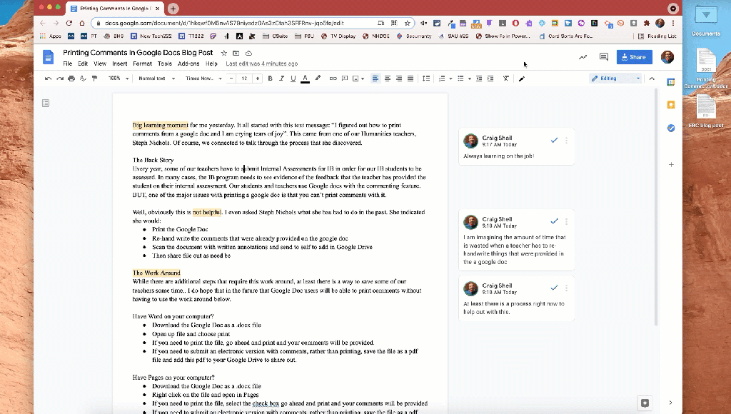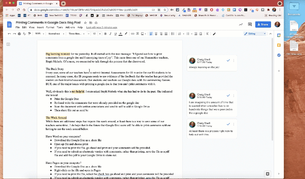 Learning moment for me yesterday. It all started with this text message on my phone: “I figured out how to print comments from a google doc and I am crying tears of joy”. This came from one of our Humanities teachers, Steph Nichols. Of course, we connected to talk through the process that she discovered.