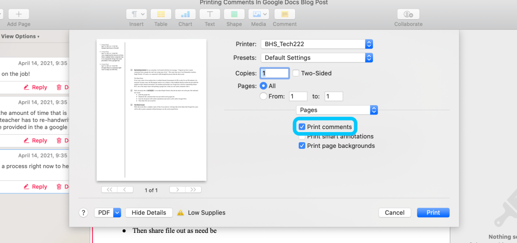 Every year, some of our teachers have to submit Internal Assessments for IB in order for our IB students to be assessed. In many cases, the IB program needs to see evidence of the feedback that the teacher has provided the student on their internal assessment. Our students and teachers use Google docs with the commenting feature. BUT, one of the major issues with printing a google doc is that you can’t print comments with it.