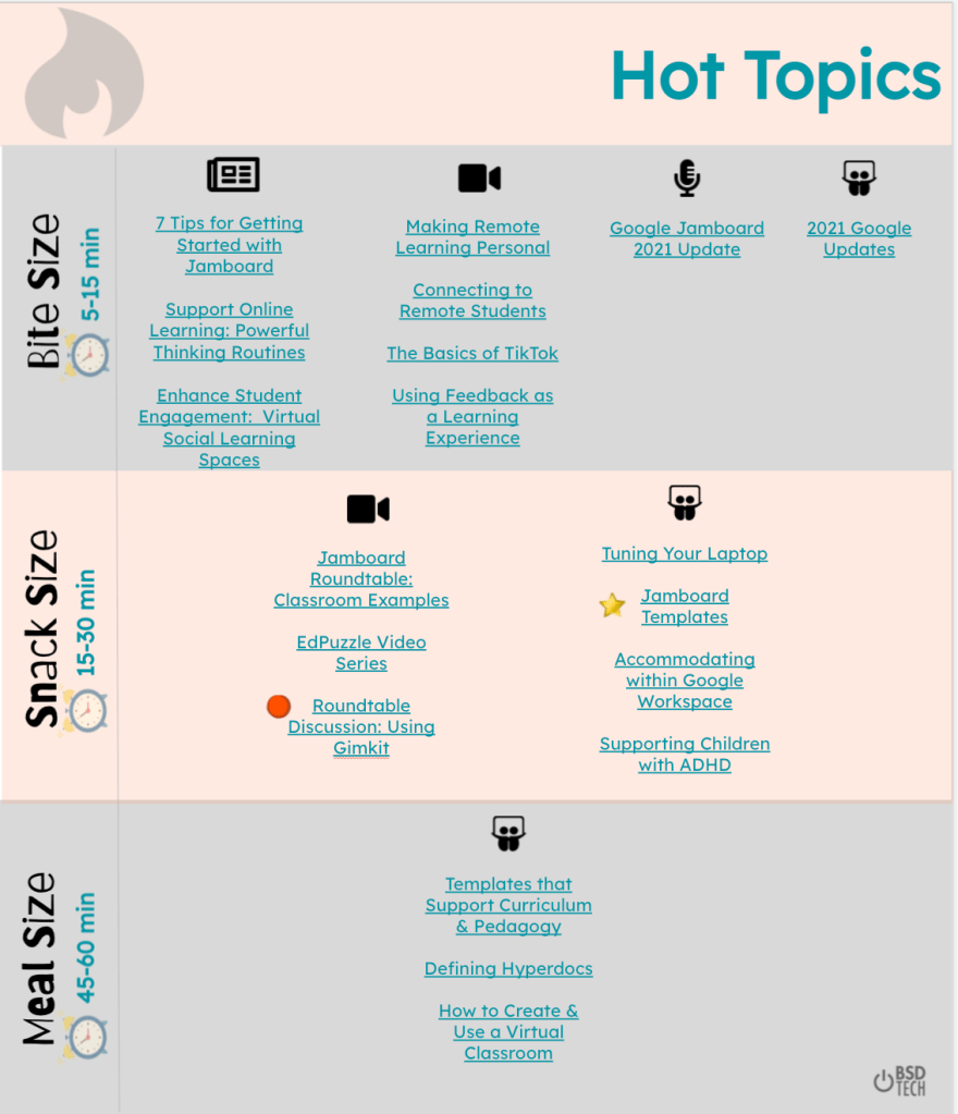Our food theme: With traditional menus at restaurants, you always have an option of ordering appetizers, meals and desserts. We wanted to try to mimic that in a way. So we created bit size (5-15 minutes), snack size (20-30 minutes), meal size (45-60 minutes) options for staff to choose from. We also came up with different choices within those types of foods. Rather than only have presentations to listen to or watch, as we have done in the past, we provided other modes, such as articles, podcasts, videos, tutorials, presentations. We also thought, if we created menus of topics, that might appeal to people to help them find the resources that have been curated. So, if I was interested in what “Hot Topics” are out there, I could look at the “Hot Topics” menu and select some resources. Below is an example of what one of the topic menus looked like (click HERE to open in a new window). To see all of the menus, click HERE.