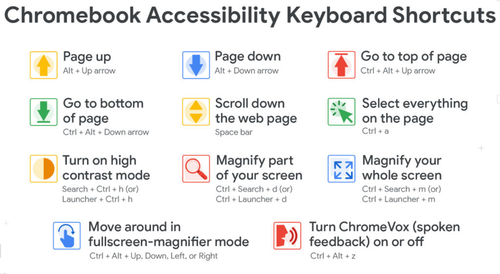 The image below was shared by the Google for Education team, giving some short cuts on turning on/off a feature in accessibility.