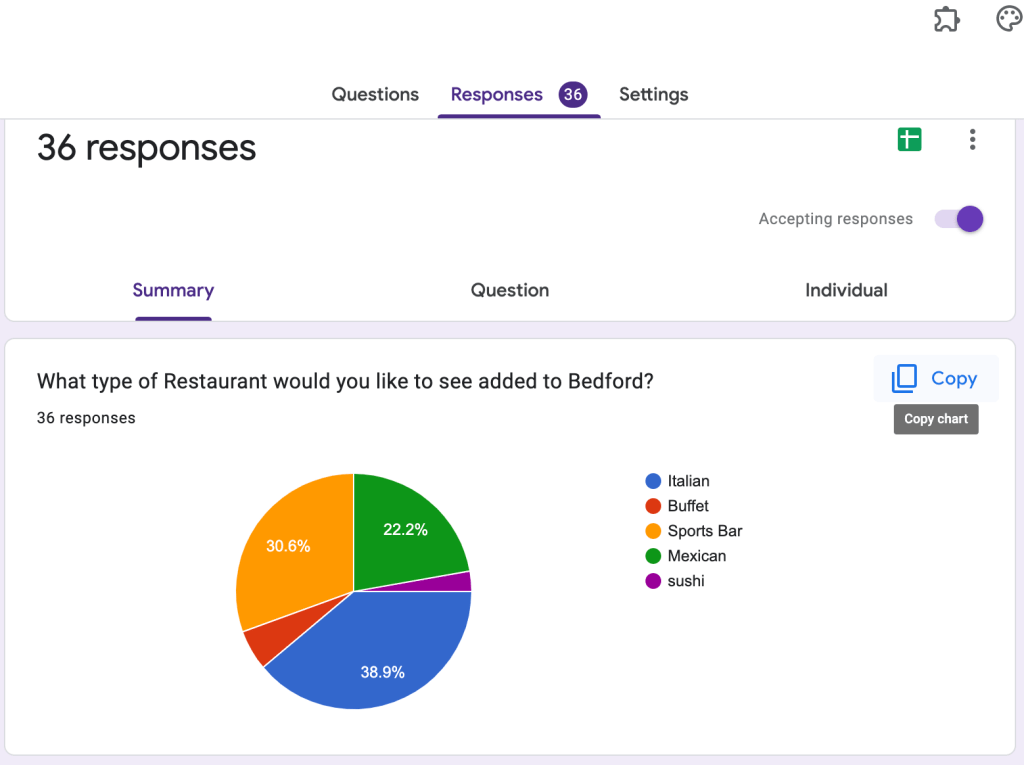 We had the conversation with students that Google Form is an excellent tool for collecting data. It is great for pulling all the data into one place – a spreadsheet. It is great for when you want a quick snap shot of the data in graph or chart form, through the responses tab. We even highlighted the fact that Google Forms now makes it easy to copy a chart or graph and paste into a Google Document or Google Slide, as seen below. This can be very helpful when needing quick visualization of data that has been collected.