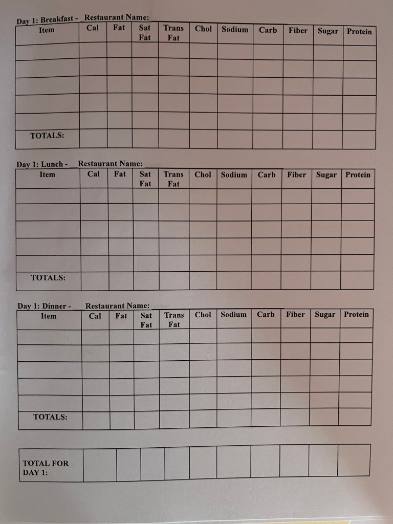 To make this happen, students are asked to document food that they would eat over a span of two days at restaurants. Using a nutrition calculator, students are able to find accurate nutritional facts. Once students document their own data, they are asked to answer questions comparing their results to the daily recommended allowance. Students in the past were given a google document similar to the image below.