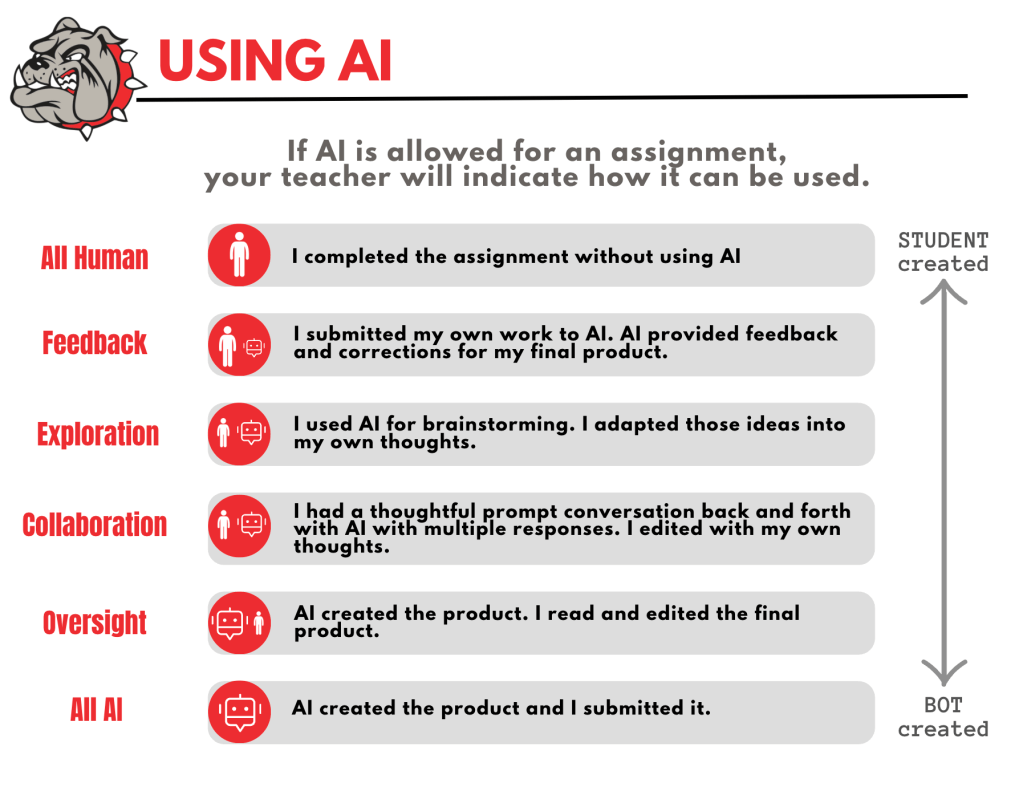 We informed students that common language has been created to help both teachers and students understand when AI might be able to be used on assignments or tasks. The AI committee (comprised of teachers, librarian, digital learning specialists, Deans of STEM and Humanities, and assistant superintendent) tweaked a scale that Pinkerton Academy, in Derry, NH, created a couple years ago. We came up with simple phrases so that if an assignment might allow the opportunity for AI to be used, a teacher can clearly indicate by it’s name. For instance, a teacher could say, “For this assignment, students are able to be in the Feedback level.” An image of our poster can be found below. The default for assignments will be ‘All Human’ unless otherwise stated by the teacher. We are thinking that this visual will be available in classrooms.