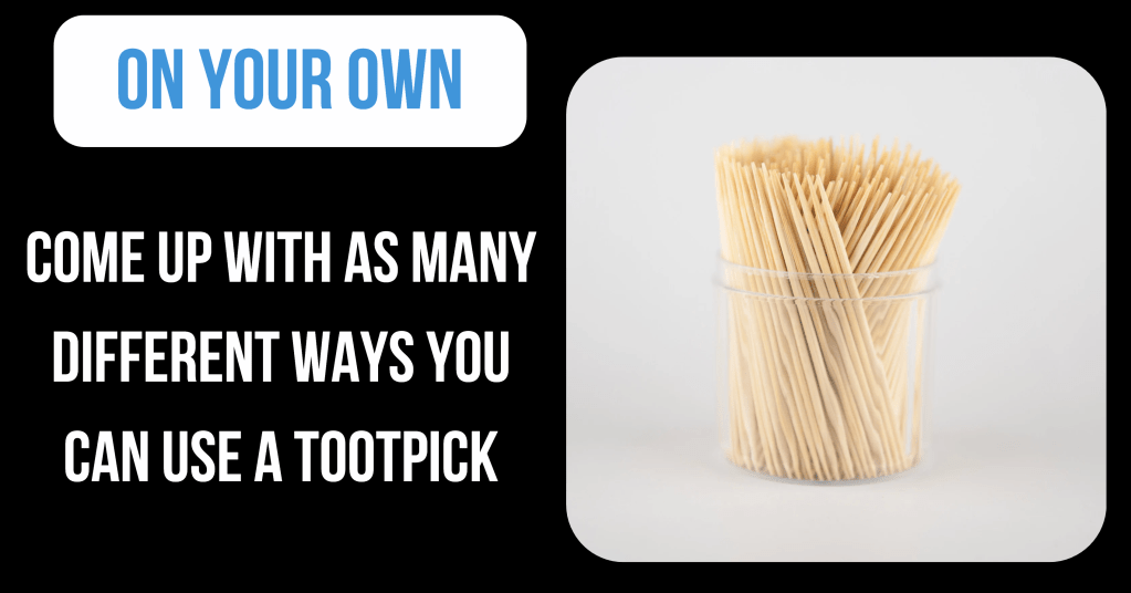 Students are told that they have one minute to come up with as many different ways to use a toothpick. The goal is to have the most. After that minute, students are then given 1.5 minutes to work with the person next to them and continue to build on their list, keeping in mind that the goal is to have the most number of ways. At the end, we ask students to raise their hands to see who had the most.