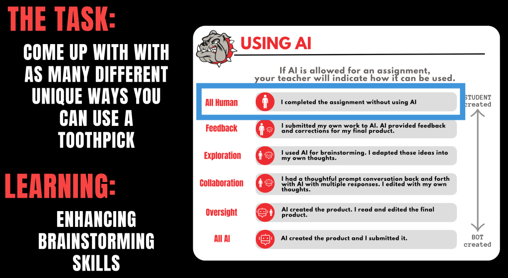 We then say to the students ‘what was the purpose of the activity?’. Well the purpose was for them to showcase their brainstorming and thinking skills. So in this example, we wanted students to use their own thinking by thinking alone, then collaborate with another individual and work together on each others’ thoughts…not AI thinking. We provide the ‘Using AI’ visual so they can see where that task would be on the list. This particular example models the All Human category.