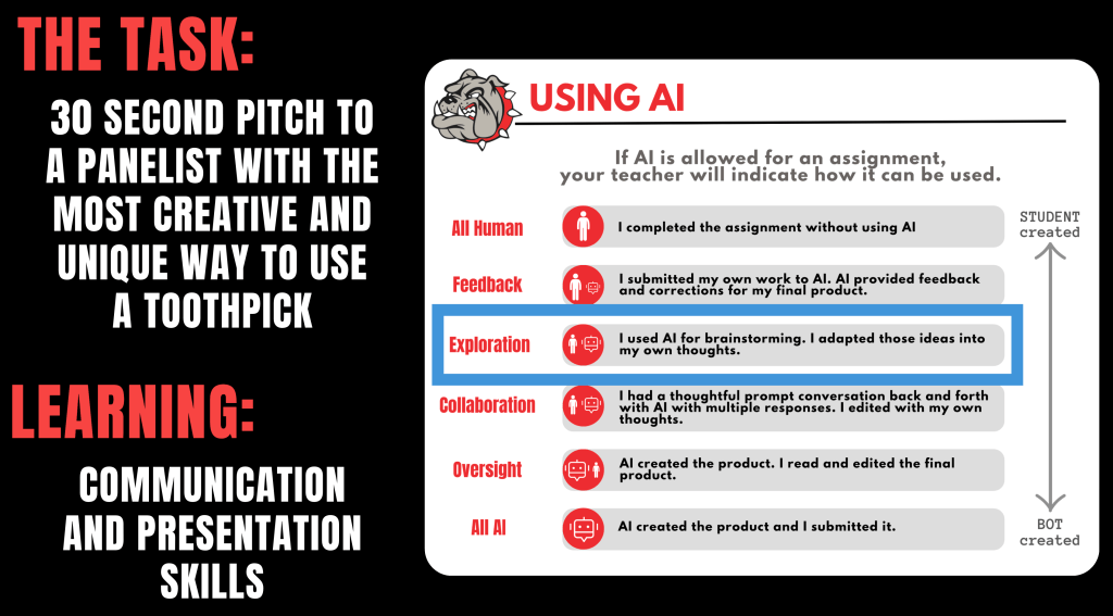 Then, we gave students two other examples. For instance: If the purpose was for students to give a 30 second pitch as to why their use case is the most unique one, then we would be assessing their communication skills. Can they convince us? In this case, they could be in the exploration row of the ‘Using AI’ visual. We aren’t assessing if they came up with the toothpick idea. Instead, we are assessing on if they can communicate their idea in a way that convinces us.