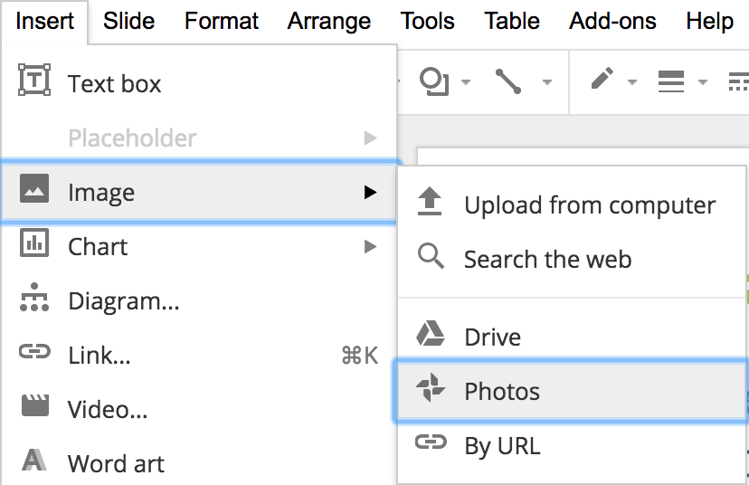 • Under the insert menu, choose Image followed by Photos. Google will search your Google Photos and you will select your GIF file.