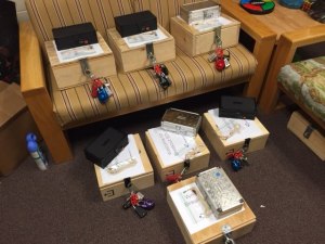 Once all of the supplies arrived and the necessary papers were printed, we then put the boxes together. Must say, this took a bit of time, especially since it was our very first time doing this. We also double checked things worked since there were going to be seven different groups running at the same time. What is extremely helpful though is that for every game, there are written instructions as well as a video that help walk you through how the game is run, with the combinations to the locks. Very helpful!